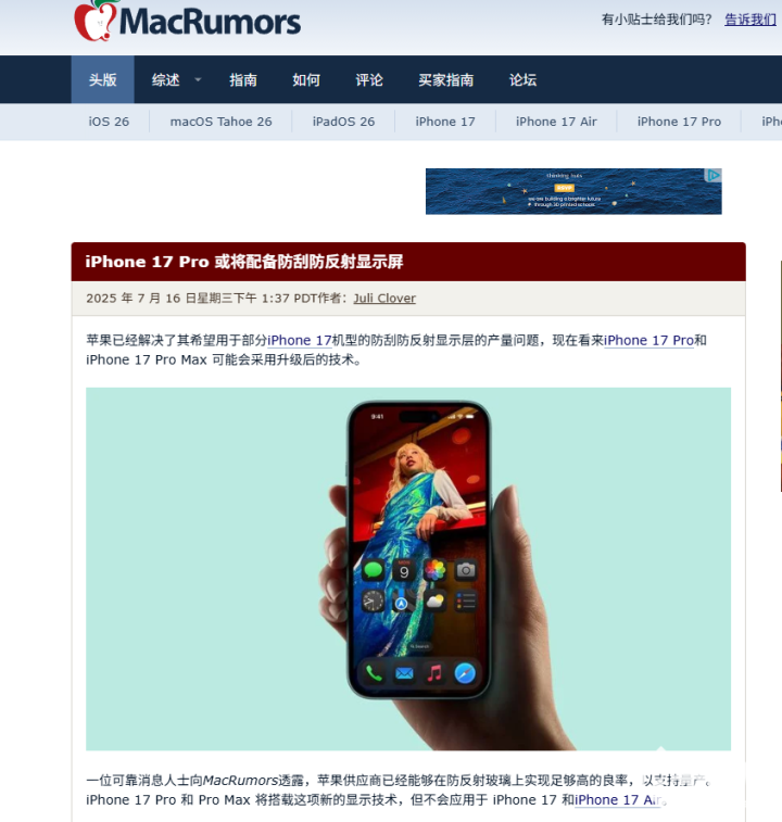 7月17日,据MacRumors报道,苹果已成功解决屏幕抗刮抗反射涂层的生产难题,该涂层有望率先应用于iPhone 17 Pro和iPhone 17 Pro Max机型。