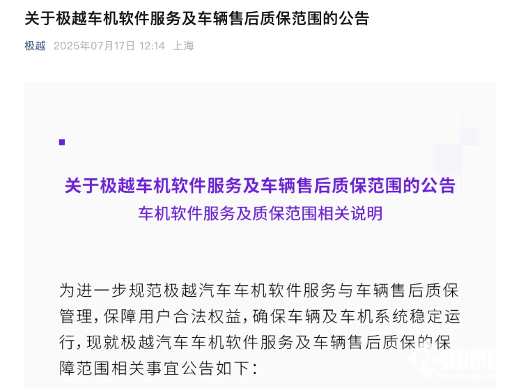 2025年7月17日,极越汽车正式对外公布车机软件服务及车辆售后质保范围细则,明确三类车辆不享受相关服务。