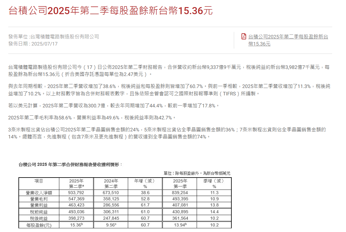在第二季度,台积电合并营收为9337.9亿新台币(约合2276.83亿人民币),较去年同期大幅增长38.6%,环比第一季度增长11.3%;净利润为3982.7亿新台币(约合970.18亿人民币),同比增长60.7%。