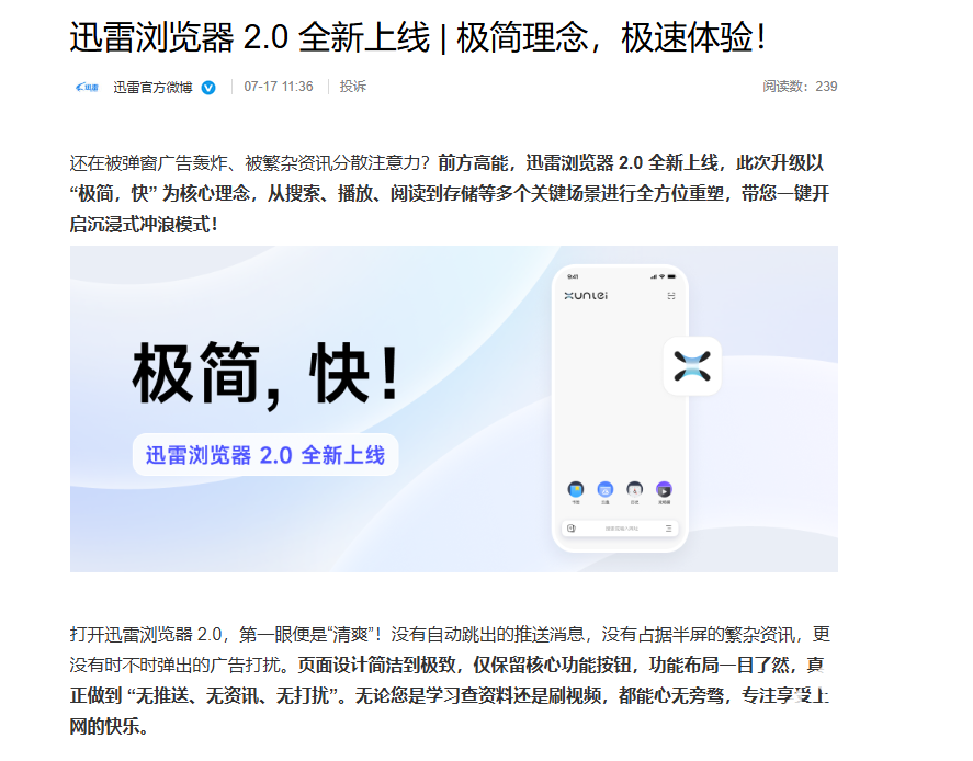 7月17日,近日迅雷浏览器2.0现已全新上线,此次升级以“极简,快”为核心理念,从搜索、播放、阅读到存储等多个关键场景进行全方位重塑。