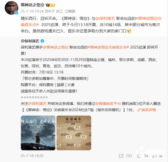 7月18日,保利演艺官宣《黑神话:悟空》2025线下主题音乐会巡演计划,将于8月30日至11月29日登陆连云港、榆林、成都、西安等10座城市,共14场演出。今日13:18正式开票。