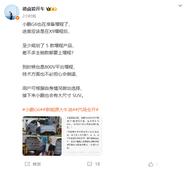 根据该博主介绍,小鹏G6增程版应该是在小鹏X9增程版之后,并且小鹏目前至少规划了 5 款增程产品,主销款可能都会上增程,也都是800V平台增程。技术方面也不必担心会倒退,用户可根据自身情况做出选择,接下来小鹏也会有大尺寸 SUV。