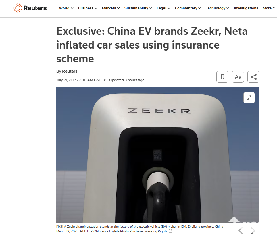 路透社:《Exclusive: China EV brands Zeekr, Neta inflated car sales using insurance scheme》Exclusive: China EV brands Zeekr, Neta inflated car sales using insurance scheme | Reuters