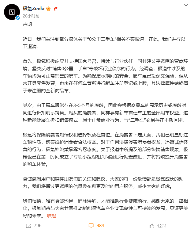 值得一提的是,极氪汽车官方在昨日下午对这一消息进行了辟谣,并表示经过调查,报道中涉及的车辆均为可正常销售的展车。为确保展示期间的安全,展车虽已投保交强险,但从未开具零售发票,也未在任何车管所进行新车注册登记或上牌,其法律属性始终属于未注册的全新商品车。并且在消费者下定页面,已明显标注车辆性质,由于展车通常存在3-5个月的库龄,因此会根据商品车的展示历史或库龄时间进行折扣明示销售。他们会切实保障消费者知情权和选择权,维护消费者合法权益。