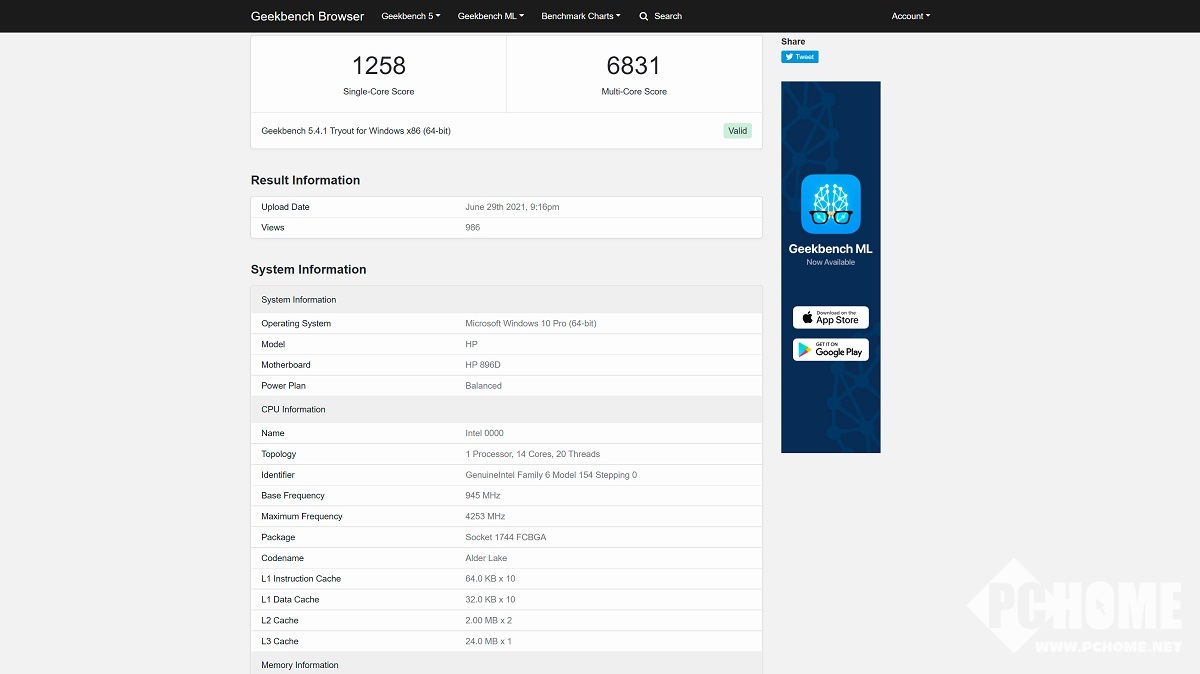 根据Geekbenck 5里的信息,测试的Alder Lake-P处理器拥有6个“Golden Cove”性能(大)核心和8个“Gracemont”效率(小)核心,总共14核心20线程,L3缓存为24MB。检测到的基础频率是945 MHz,睿频是4253 MHz,其单核基准测试成绩为1258分,多核基准测试成绩为6831分。