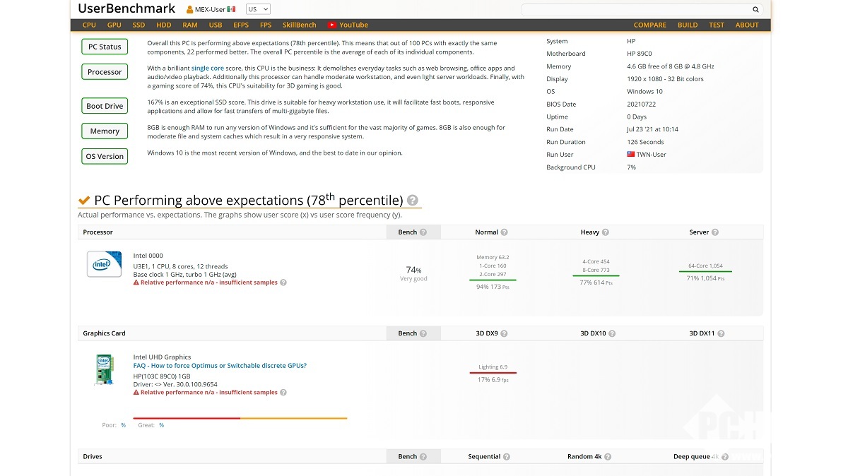 作为对比,AMD Ryzen 7 5800H在UserBenchmark的单/双核基准测试平均成绩为133分和898分。