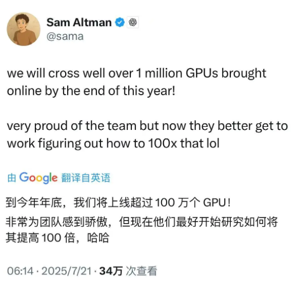 7月21日消息,OpenAI首席执行官Sam Altman发文称,到今年年底,将有超过100万个GPU上线。他为这个团队感到骄傲,但他们最好开始想办法把这个数字提高至100倍。