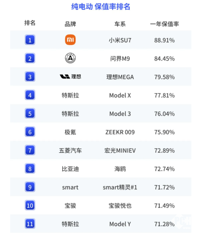 第二是问界M9的84.45%,理想Mega以79.58%的保值率位列第三。此外,特斯拉Model X(77.81%)、Model 3(76.04%)、极氪009(75.9%)、五菱宏光MINI EV(72.89%)、比亚迪海鸥(72.74%)、Smart精灵#1(71.72%)、宝骏悦也(71.49%)跻身前十,Model Y则位列第十一。对此小米创办人,董事长兼CEO雷军也转发并感谢大家的支持。
