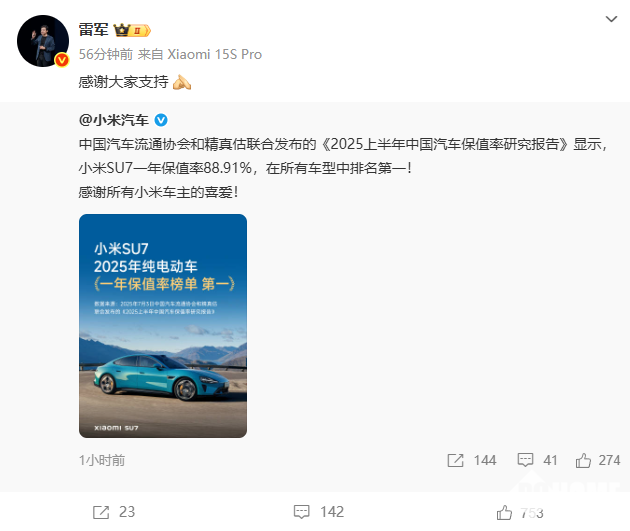 7月21日,小米汽车官方今日发文称,中国汽车流通协会和精真估联合发布的《2025上半年中国汽车保值率研究报告》显示,小米SU7一年保值率88.91%,在所有纯电车型中排名第一。