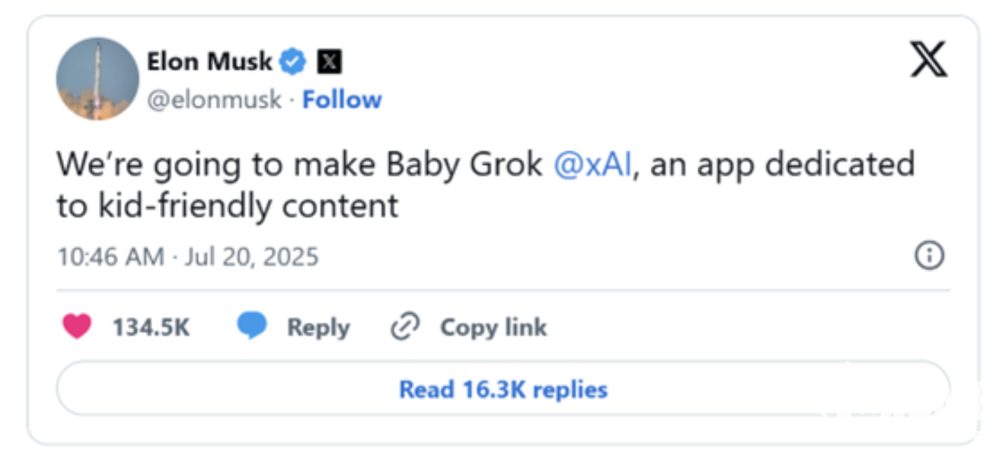 印媒报道称,马斯克未透露“Baby Grok”的具体功能细节,仅表示该应用将为儿童提供“友好型内容”,旨在为年轻用户创建一个安全的数字空间。马斯克此举标志着xAI发展的新方向,此前该公司一直专注于通用AI模型。