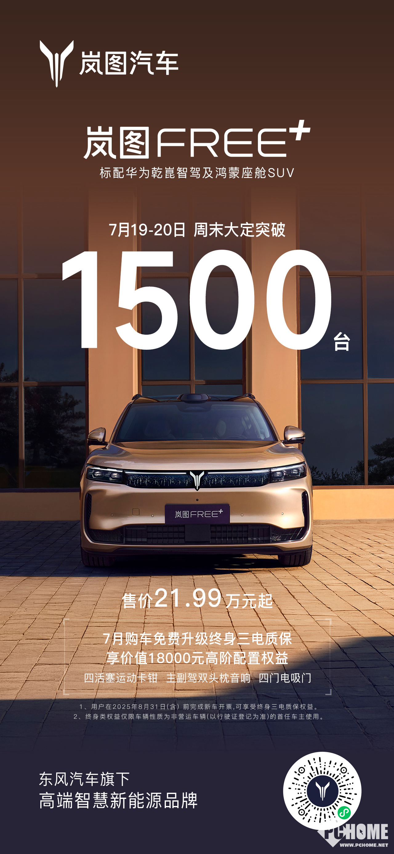 2025年7月21日,岚图汽车官宣,岚图FREE+上市9天,收获2万张大定订单。在7月19-20日的周末期间,FREE+大定数量强势突破1500台。