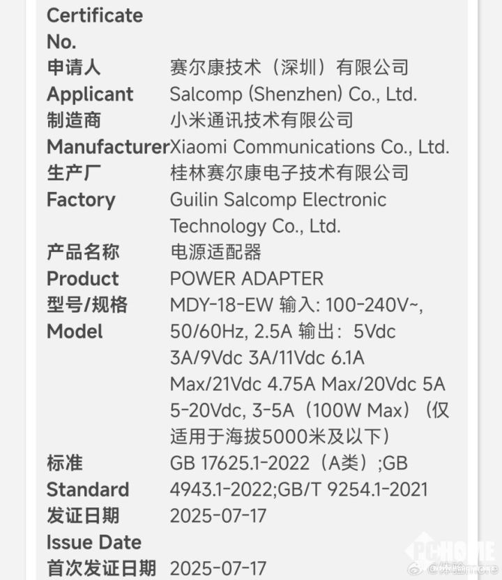 7月21日,据博主“智慧皮卡丘”爆料,小米一款型号为MDY-18-EW的全新100W充电器通过国家认证。该充电器有望成为小米16系列的标配配件,提升充电效率与兼容性。