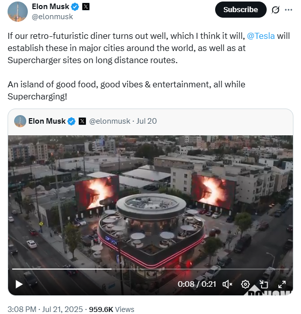 2025年7月21日消息,特斯拉CEO伊隆·马斯克Elon Musk在社交媒体发文,特斯拉首家主题餐厅开始营业。餐厅坐落于洛杉矶圣莫妮卡大道,餐厅设计风格为1950年代的美式复古风。特斯拉餐厅整体上延续了美国汽车餐厅文化,甚至复刻了穿着轮滑鞋的餐厅服务员、两块45英尺的巨幕汽车影院和汉堡、薯条、炸鸡、奶昔等经典快餐食物等。