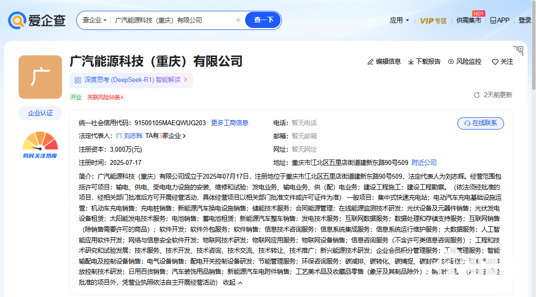 广汽能源科技(重庆)有限公司正式成立,经营范围涵盖人工智能应用软件开发、网络与信息安全软件开发、物联网技术研发与应用服务等多个领域。