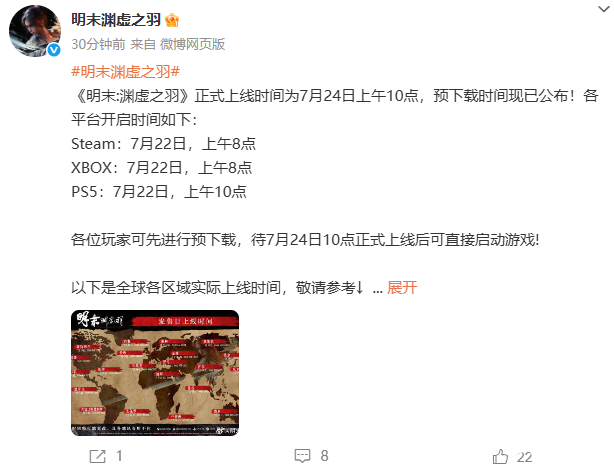 7月21日消息,国产魂系角色扮演游戏《明末:渊虚之羽》官方微博发文称,该游戏将于7月24日上午10点正式上线,同时也公布了7月22日为预下载时间。