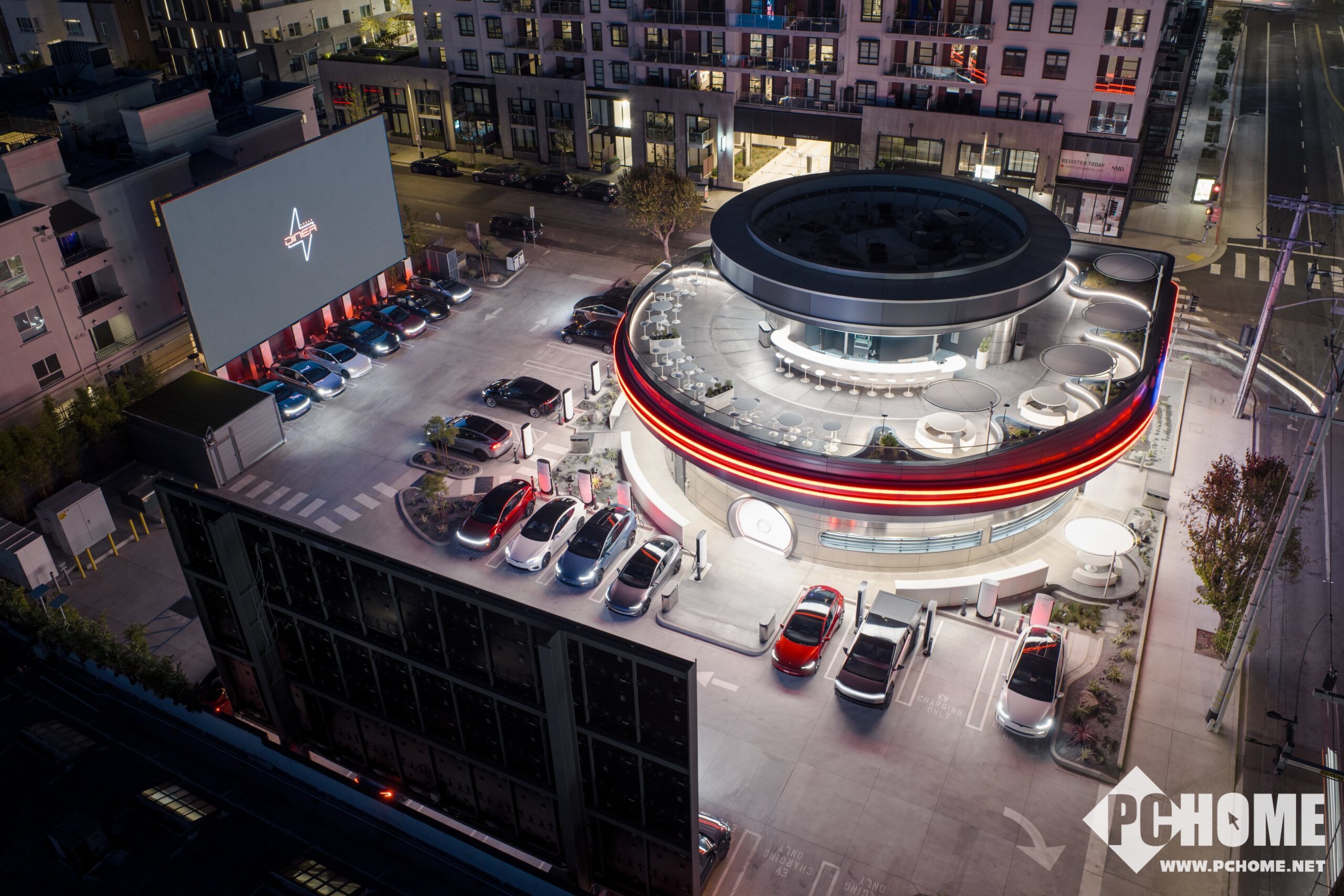 特斯拉历时七年打造的超级充电站餐厅(Supercharger Diner)在洛杉矶圣莫尼卡大道正式开业。