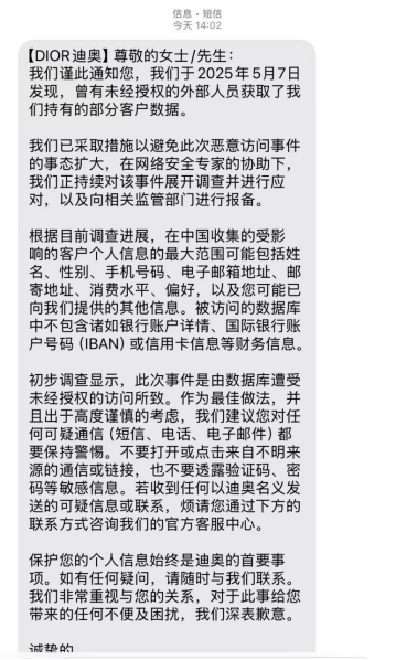 迪奥近日向全球多个市场的客户发出通知,确认其于2025年1月遭遇网络攻击,导致部分客户隐私信息外泄。