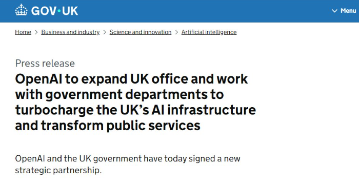 7月22日消息,OpenAI与英国政府签署了战略合作伙伴关系,双方将在人工智能安全研究、基础设施投资等关键领域展开深度合作。除了达成合作协议外,OpenAI还确认了扩大英国业务的意图。