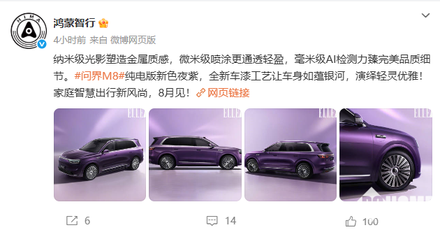 7月22日,鸿蒙智行官方今日发布了问界M8纯电版的全新配色—夜紫的官图,并且还透露该配色所使用的工艺纳米级光影塑造金属质感,微米级喷涂更通透轻盈,毫米级AI检测。预计将在8月正式上市。