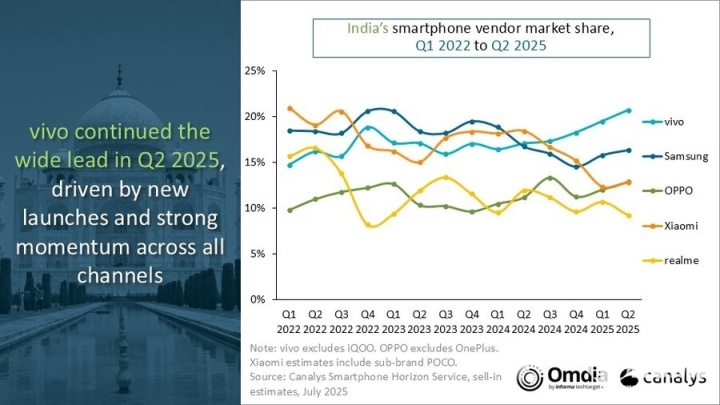 7月22日,根据市场研究机构Canalys今日发布报告,2025年第二季度印度智能手机出货量达3900万部,同比增长7%。其中vivo(不含iQOO)以810万部、21%的市场份额登顶,这也是其连续第四个季度夺冠。小米排名第3,苹果位居第6。