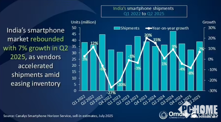 7月22日,根据市场研究机构Canalys今日发布报告,2025年第二季度印度智能手机出货量达3900万部,同比增长7%。其中vivo(不含iQOO)以810万部、21%的市场份额登顶,这也是其连续第四个季度夺冠。