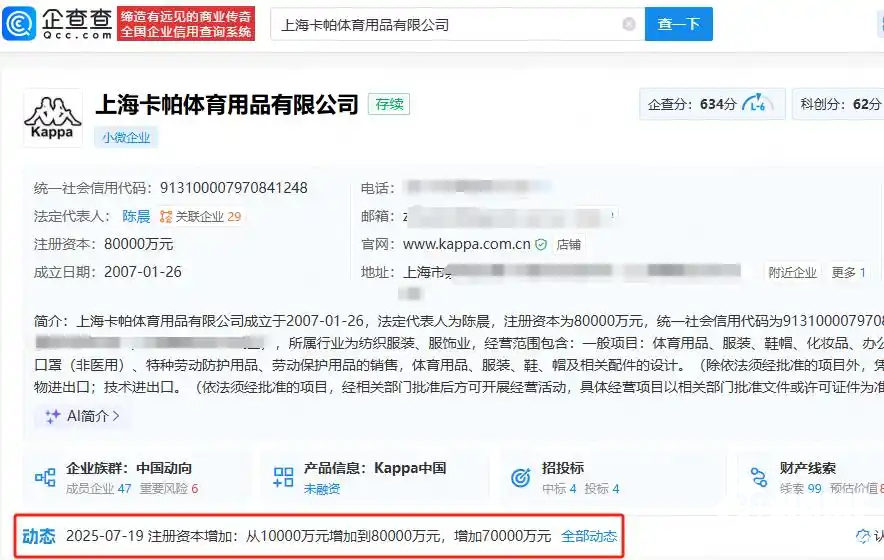 据爱企查信息显示,近日,Kappa中国关联公司上海卡帕体育用品有限公司完成工商变更,注册资本由1亿元人民币大幅增至8亿元人民币,增幅高达700%。此次增资动作引发市场关注,或预示着品牌在华业务将迎来新一轮战略布局。