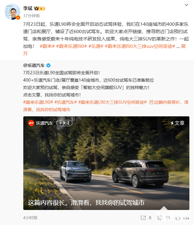 7月22日,李斌今日发文称,明日乐道L90将会全面开启动态试驾体验,在140座城市的400多家乐道门店和展厅,铺设了近600台试驾车。并且表示,欢迎大家亲身感受蔚来十年纯电技术研发投入成果,纯电大三排SUV的革新之作。