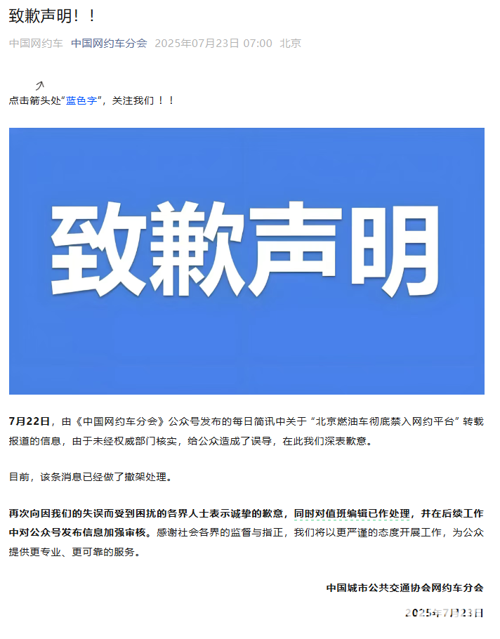7月23日,昨日北京燃油车已禁入网约车的消息引发大众关注,据了解,该消息的来源是中国网约车分会,他们今日删除了关于“北京燃油车彻底禁入网约车平台”的相关报道,并发布了致歉声明。
