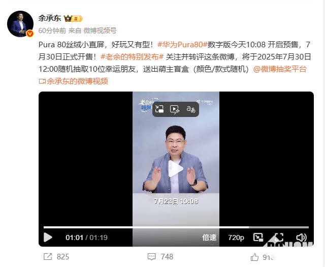 7月23日,华为常务董事、终端BG董事长余承东今日在社交媒体平台上发布了一条视频,在其中介绍了华为Pura 80数字版,同时还公布了这款手机的售价。