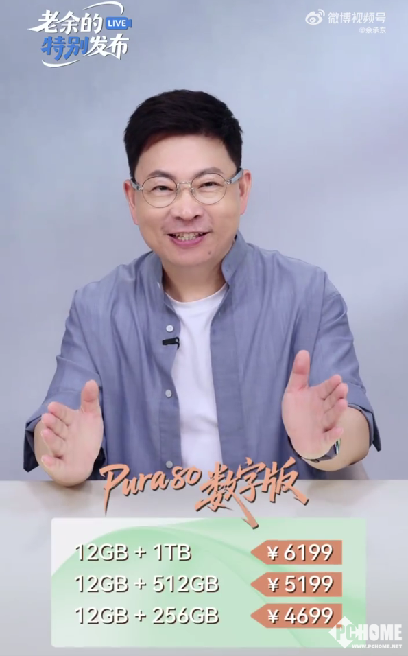 7月23日,华为常务董事、终端BG董事长余承东今日在社交媒体平台上发布了一条视频,在其中介绍了华为Pura 80数字版,同时还公布了这款手机的售价,共三个版本:12+256GB 4699元、12+512GB 5199元、12GB+1TB 6199元。并表示将在今日10:08开启预售,7月30日正式开售。