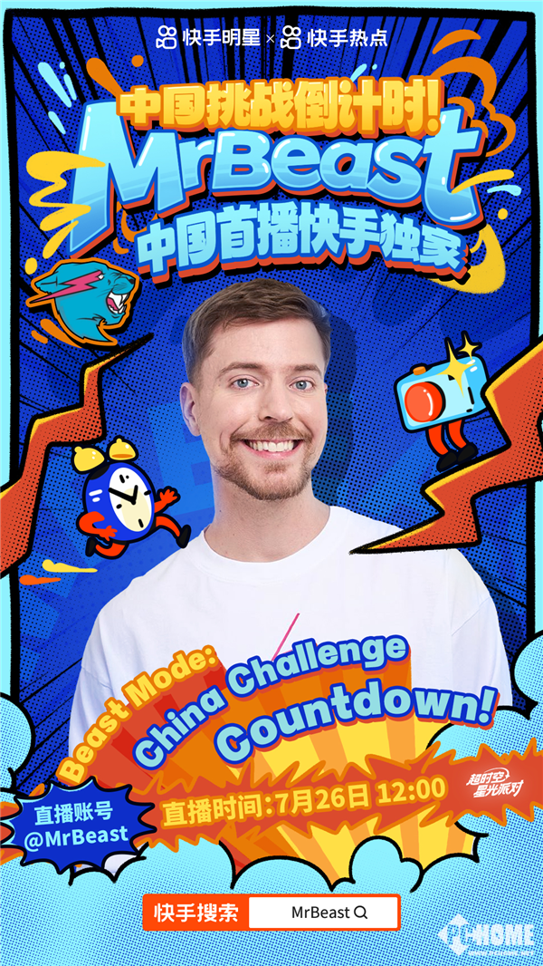 7月23日,近日号称“全球第一网红”的海外顶流博主野兽先生(MrBeast)宣布将在美国隔空开启其中文互联网平台直播首秀,并定于7月26日在快手播出。
