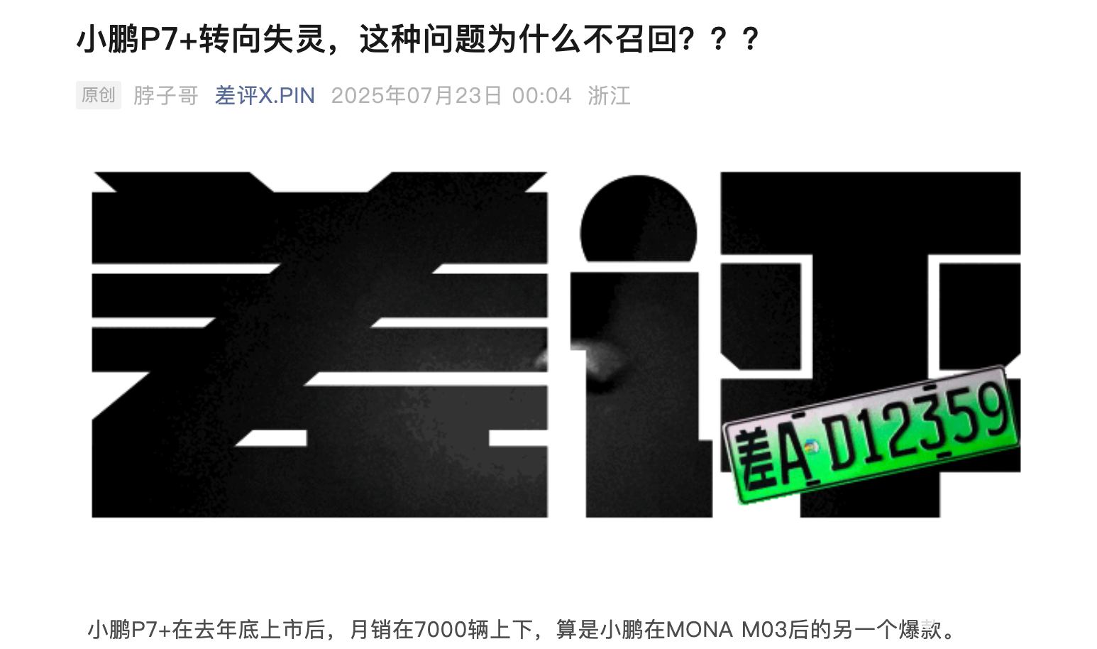 2025年7月23日,PChome发现,在缺陷汽车产品信息收集和汽车消费者投诉信息受理平台车质网,最近一周(7月17日-7月23日)投诉排名总榜,小鹏P7+凭54条投诉量,成功登顶。