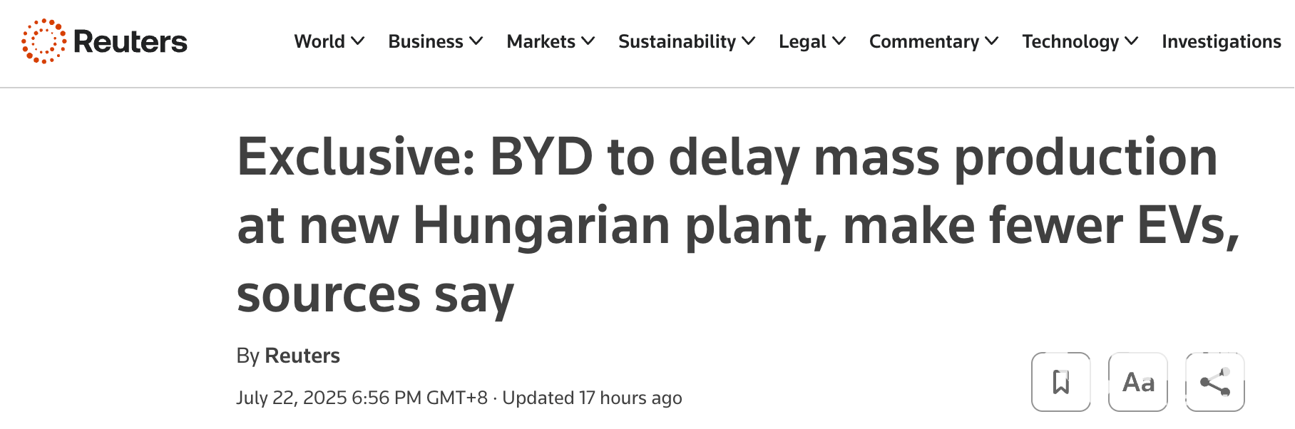 当地时间2025年7月22日,路透社援引两位知情人士消息称,比亚迪将把其位于匈牙利的新电动汽车工厂的量产推迟至2026年,并且至少在头两年内该工厂将以低于产能的方式运行。