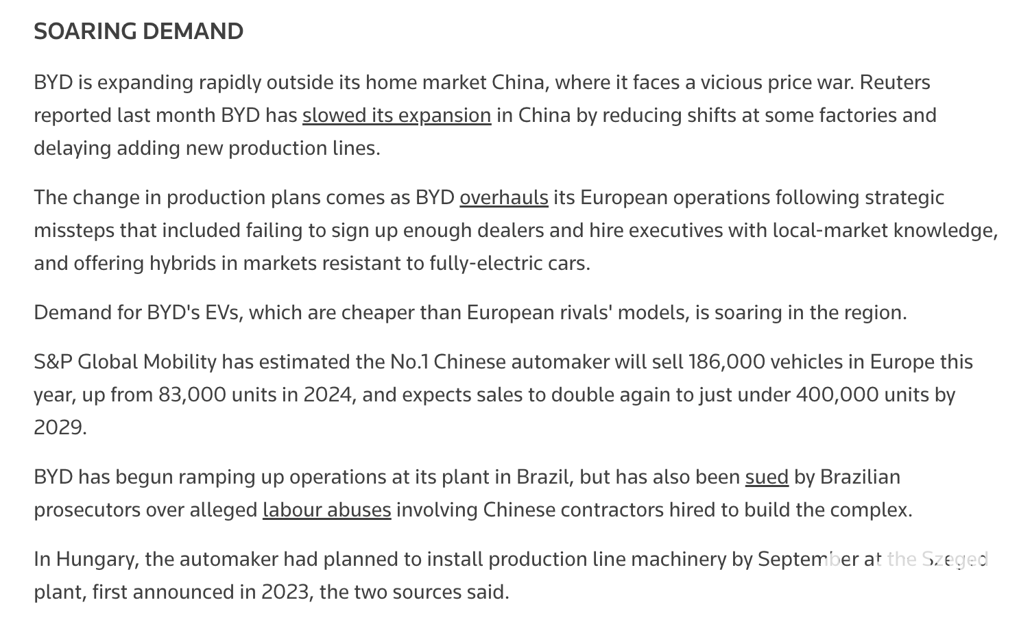 路透社认为,转向在土耳其生产更廉价的产品将凸显比亚迪面临的挑战,其希望在欧洲生产汽车以避免惩罚性关税,但又因该地区较高的工资和能源成本而却步。
