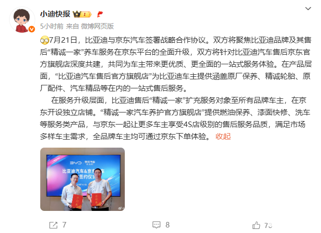 7月23日,据知名汽车博主“小迪快报”今日发文透露,比亚迪与京东汽车在7月21日签署战略合作协议。双方将聚焦比亚迪品牌及其售后“精诚一家”养车服务在京东平台的全面升级,为车主带来更优质的一站式服务体验。