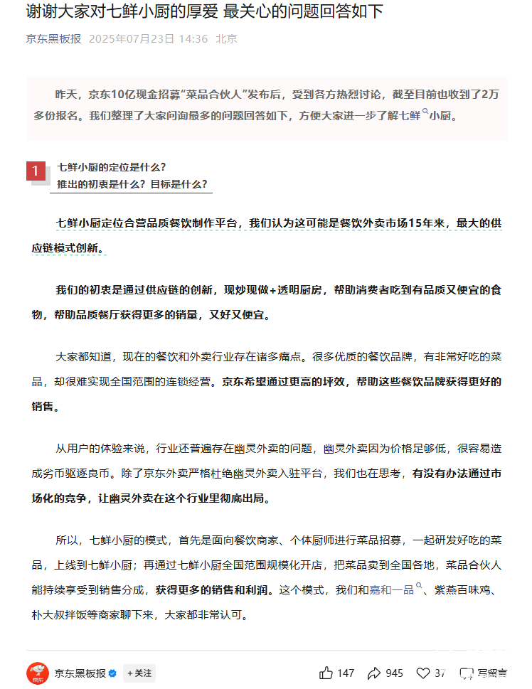 7月23日,京东旗下外卖自营门店的“七鲜小厨”昨日宣布正式启动“菜品合伙人”招募计划,10亿现金为1000道招牌菜寻找合伙人。今日在京东黑板报公众号上回应了有关定位、目标等网友关心的问题。