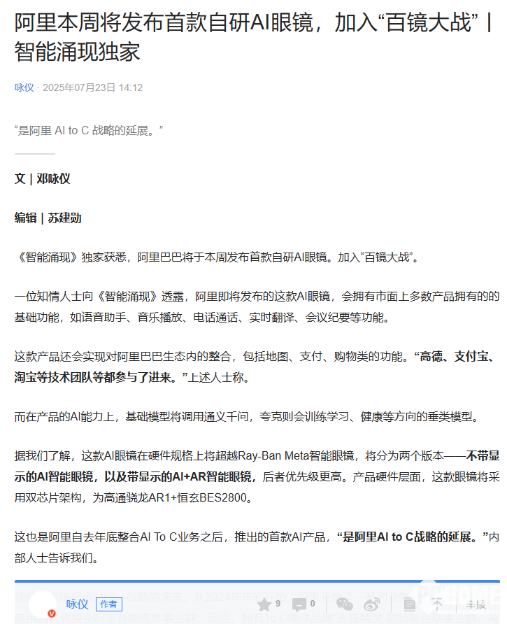 7月23日,据36氪旗下《智能涌现》报道,阿里巴巴即将在本周推出其首款自研 AI 眼镜,正式加入“百镜大战”。