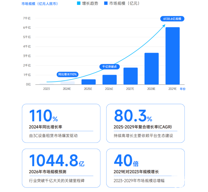 据《循环经济背景下的消费租赁行业健康发展白皮书》数据,2026年,消费租赁行业将突破千亿大关,预测市场规模将达到1044.8亿,预计2029年,消费租赁行业市场规模实现40倍增长,将达到6138.6亿。