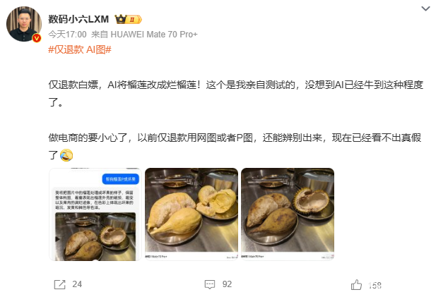 有博主表示,做电商的需要小心了,以前用P图还能看出来,但是现在使用AI已经看不出真假了。这样的行为令商家防不胜防,此前淘宝、拼多多等平台2025年全面取消“强制仅退款”,改为商家自主决策,根源正是规则滥用导致生态失衡。如今随着AI技术的快速发展,有越来越多利用AI来达到不正当目的的案例出现,怎样去限制这些问题的显现,或许是未来很长时间一个讨论的话题