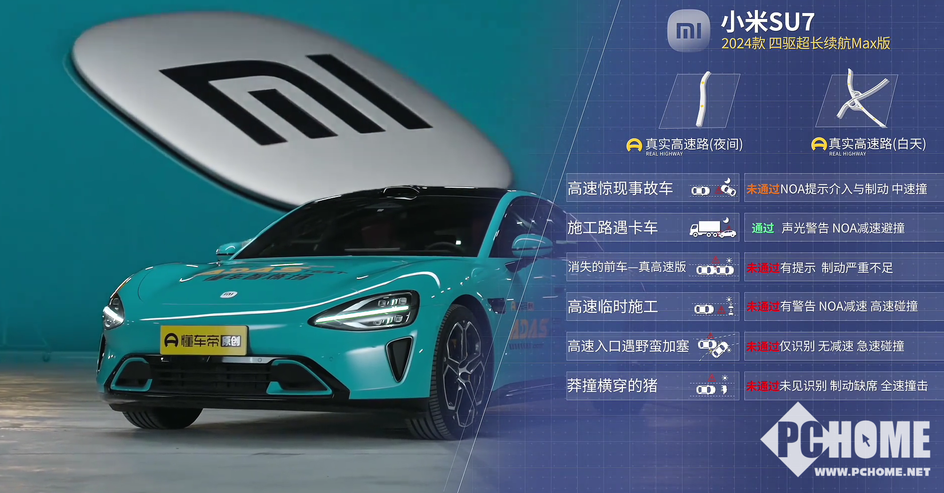 在懂车帝的测试视频中我们可以发现,小米SU7在高速路段事故模拟下的6个测试中仅通过了1个,并且其中有2个测试存在识别到危险但是提醒过晚,NOA提前退出,自动转为人为接管,并且给出制动的力度很低。还有一个测试甚至都没有识别到。