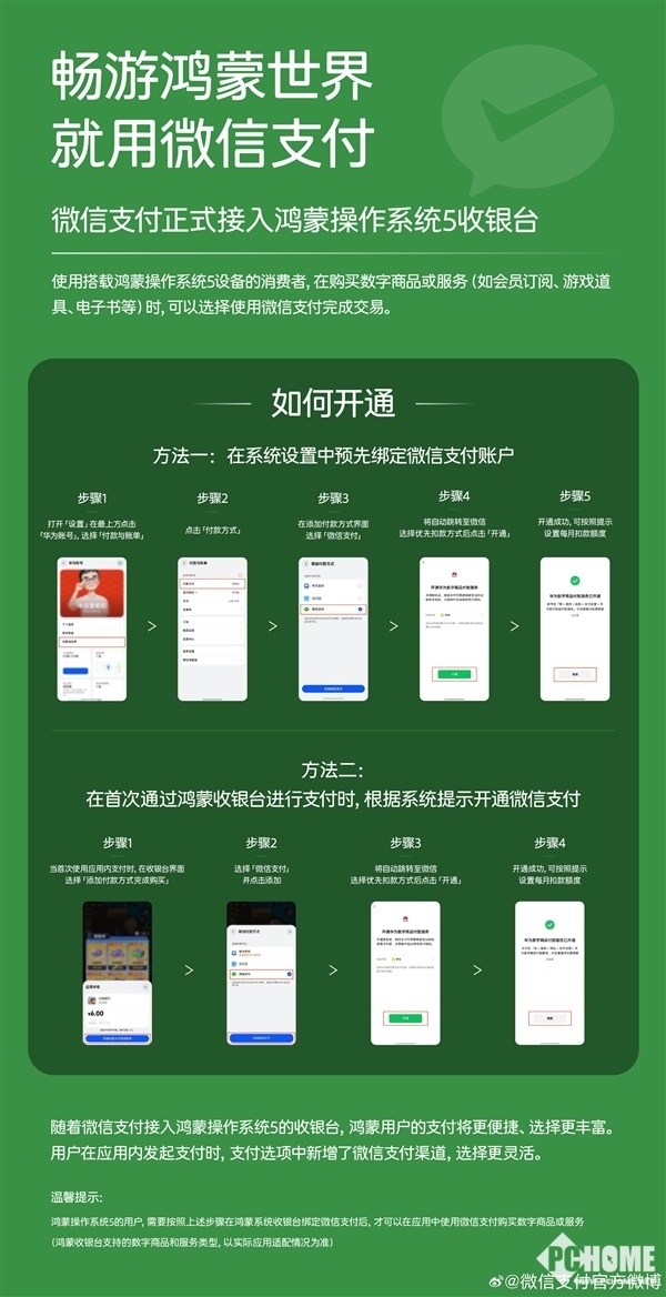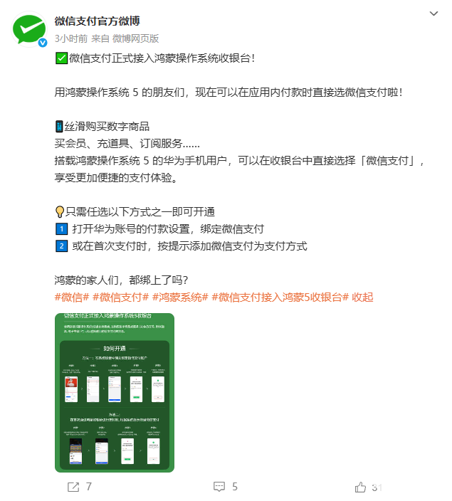 7月24日 ,微信支付今日正式宣布接入鸿蒙操作系统5的收银台功能,这一举措将为搭载鸿蒙操作系统5的华为手机用户带来更加便捷的支付体验。