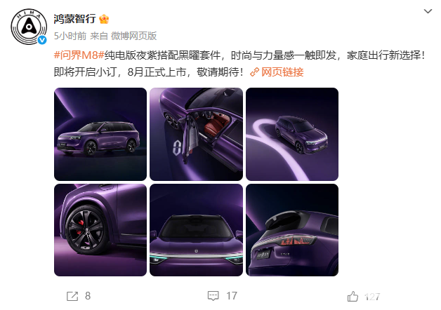 7月24日,鸿蒙智行官方今日公布了问界M8纯电版夜紫搭配黑曜套件的外观,宣称“时尚与力量感一触即发”。并且表示新车即将开启小订,将于8月正式上市。