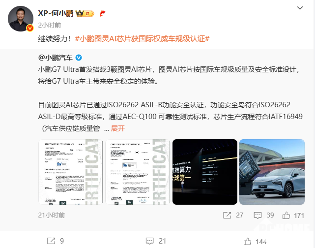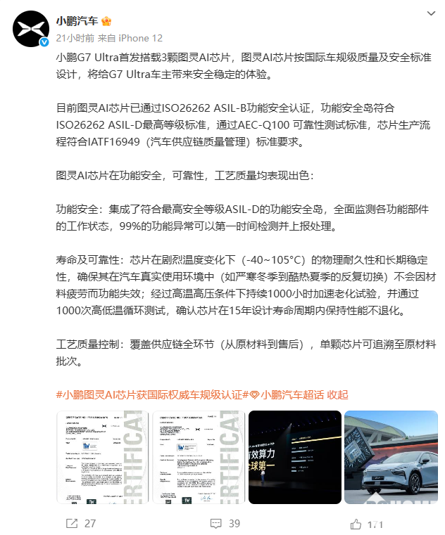 7月24日消息,小鹏汽车官方昨日介绍,小鹏G7 Ultra首发搭载的3颗图灵AI芯片,按国际车规级质量及安全标准设计。目前,该芯片已通过ISO26262 ASIL-B功能安全认证,功能安全岛符合ISO26262 ASIL-D最高等级标准,还通过AEC-Q100可靠性测试标准,芯片生产流程符合IATF16949(汽车供应链质量管理)标准要求。