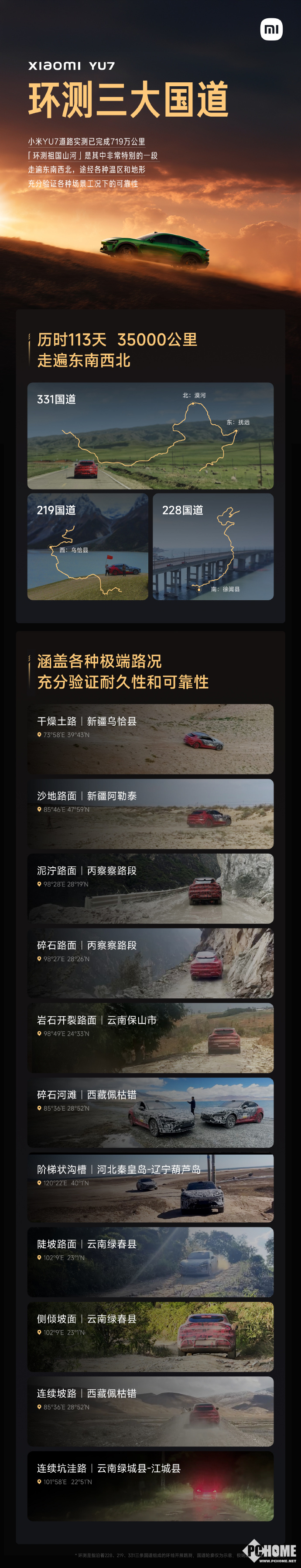 小米汽车表示,截至目前,小米YU7道路实测已完成719万公里,覆盖337个城市。“环测三大国道”只是其中的一小段路,未来YU7将探索广阔的祖国山河。