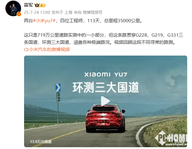 2025年7月24日消息,小米汽车官方宣布,小米YU7路测团队已经完成贯穿G228、G219、G331三条国道,719万公里道路实测,完成了各种极端路况场景测试。