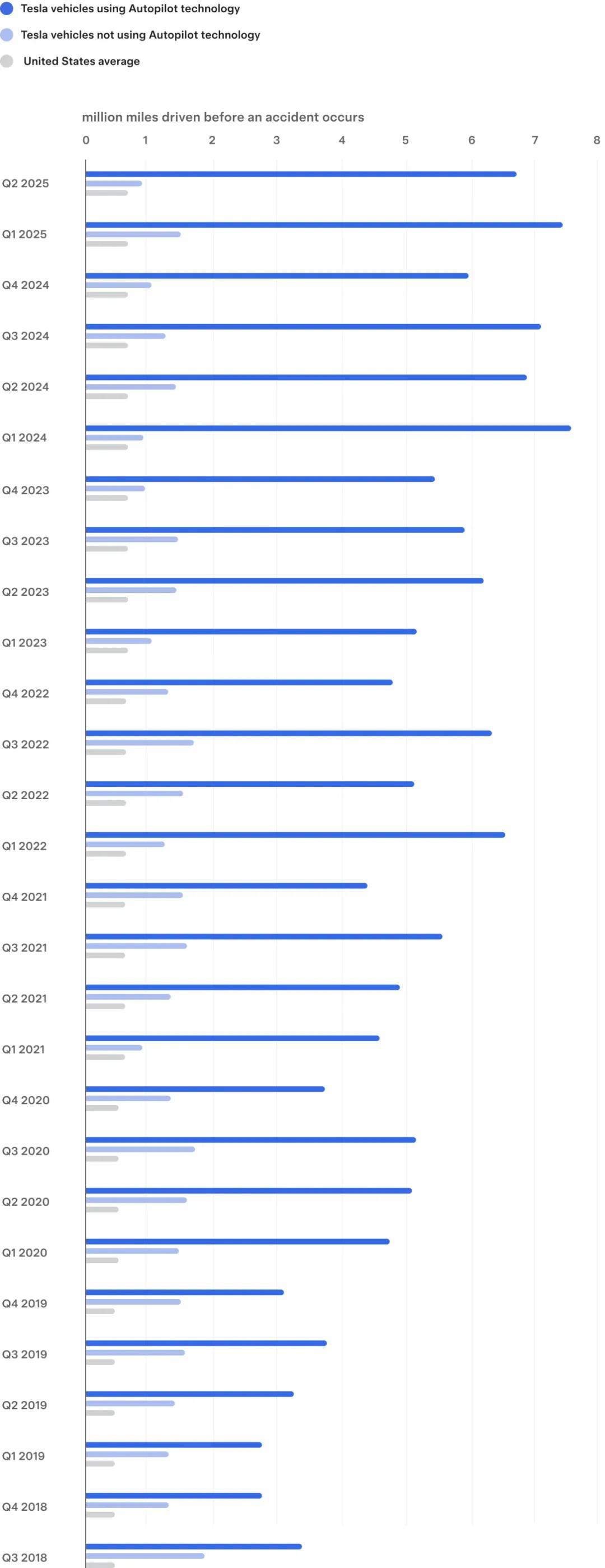 报告数据显示,启用Autopilot技术的车辆,平均每行驶669万英里(约1076.7万公里)才发生一次事故。相较之下,美国国家公路交通安全管理局和联邦公路管理局统计的2023年美国平均水平为每70.2万英里发生一次交通事故,差距显著。而未使用Autopilot的特斯拉车辆,事故发生间隔为每96.3万英里一次。