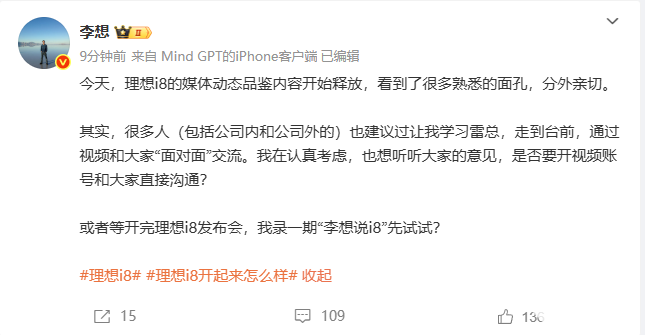 7月24日,理想汽车CEO李想发文表示,很多人让他学习雷军通过视频和大家“面对面”沟通,他本人目前也在认真考虑此事。或许在理想i8的发布会后,他会先录一期“李想说i8”试试。