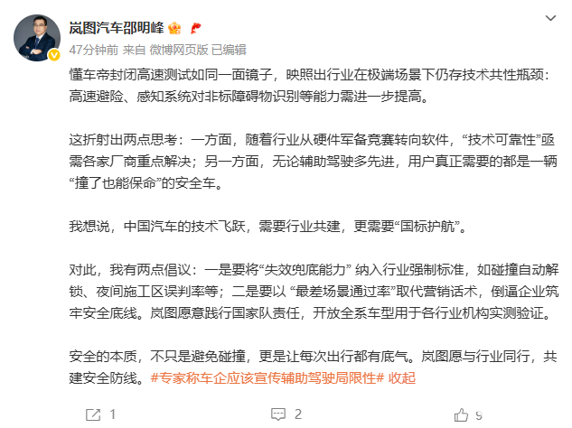岚图汽车CBO、销售公司总经理邵明峰发文表示,懂车帝封闭高速测试如同一面镜子,映照出行业在极端场景下仍存技术共性瓶颈