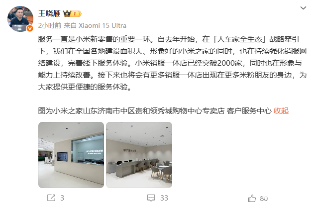 7月24日,小米集团高级副总裁、中国区总裁王晓雁今日发文表示,自去年开始,在「人车家全生态」战略牵引下,在建设小米之家的同时,也在持续强化销服网络建设,完善线下服务体验。目前小米销服一体店已经突破2000家