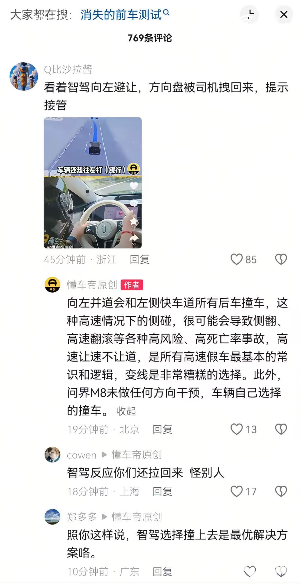网络上目前对于懂车帝该测试的争议非常大,有网友表示在测试时,完全没有控制好变量。争议主要集中在对于问界M9与问界M8的测试,有网友表示问界M8被人为的将智驾调整为了激进模式。还有网友表示在高速模拟中的“消失的前车”这一项测试,问界M9的智驾已经计算好了可以向左变道,不会与左后方来车相撞,但在变道途中,测试员自己向右打方向导致了智驾退出转为了人为接管,才使测试失败。但懂车帝称高速让速不让道,变线是非常糟糕的选择。